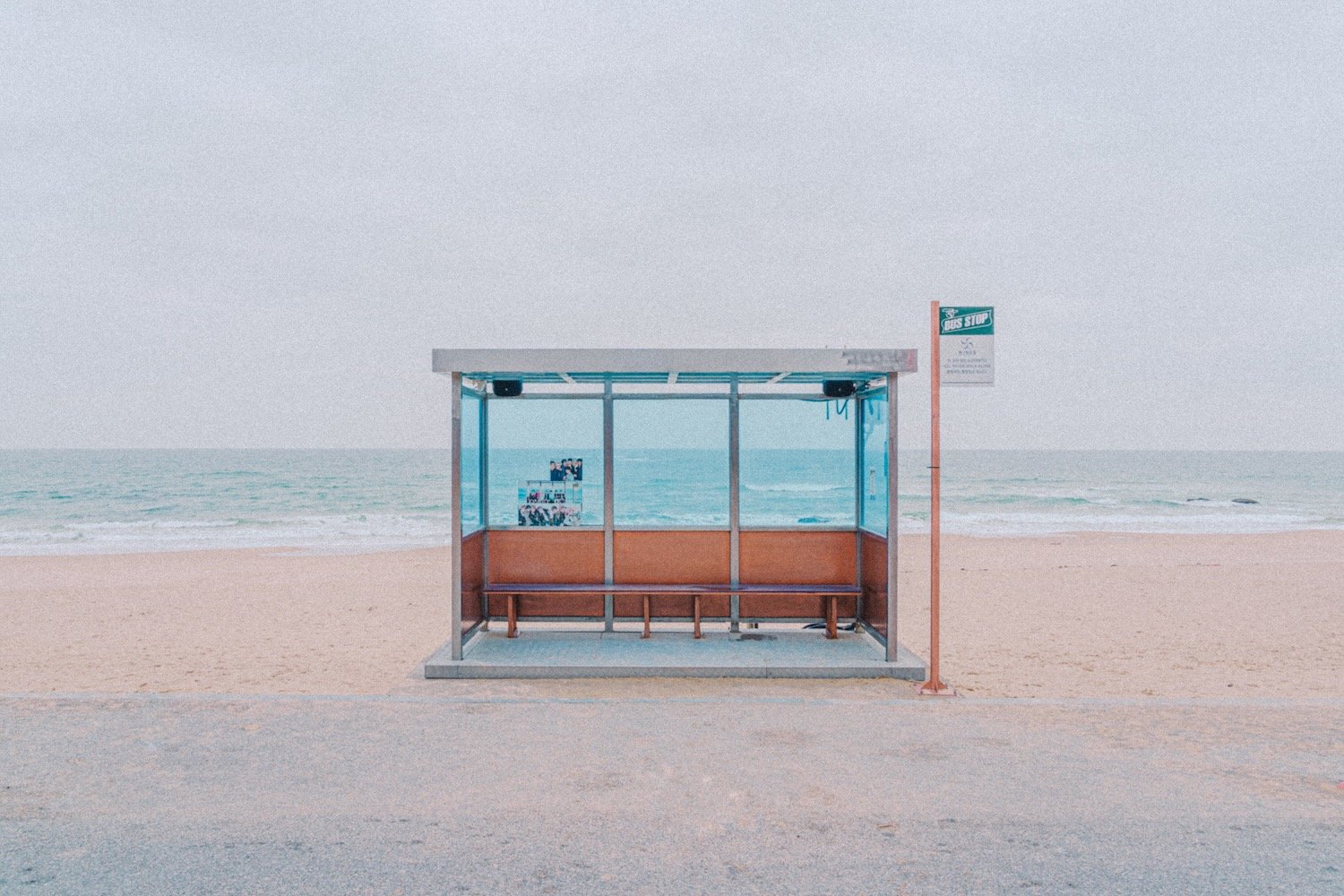 A bus stop at Jumunjin Beach featured on BTS’s “You Never Walk Alone” album cover (2017).