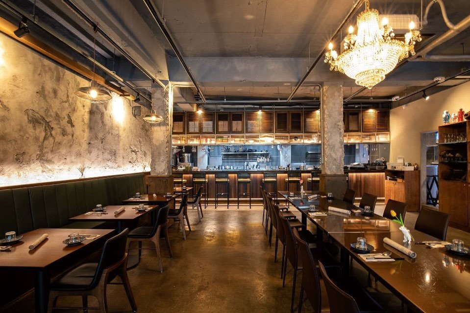The spacious venue features an open kitchen where diners can watch the cooking, with seating options ranging from group tables to bar seats, making it suitable for gatherings.