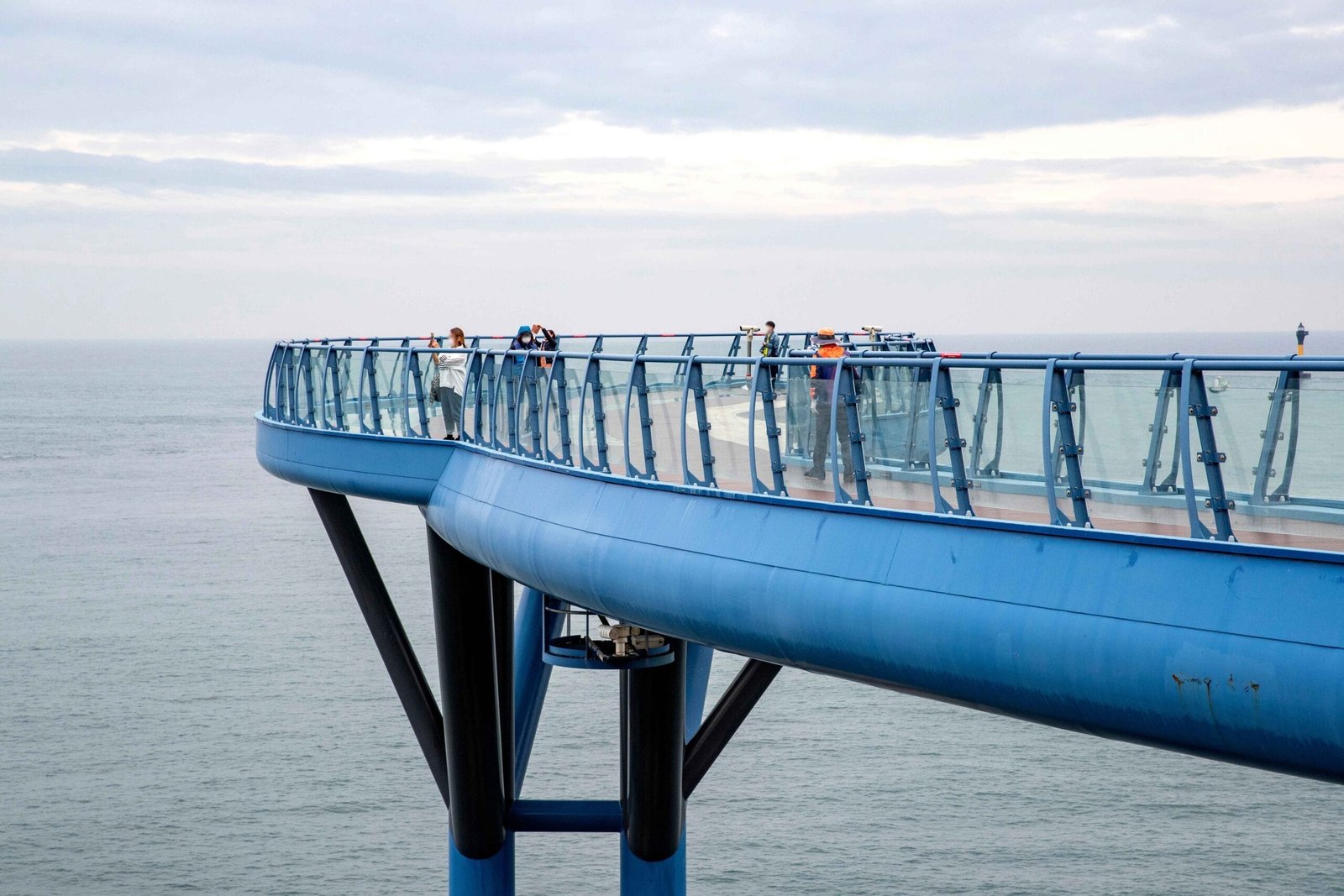 Opened in September 2017, the observatory is 72.5 meters long and 3-11.5 meters wide, and is shaped like a crescent moon, jutting out into the sea.