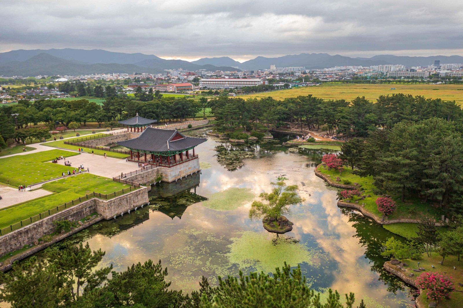 Donggung Palace was the residence of the Silla Crown Prince, where state officials and foreign dignitaries were received, and banquets were held. Wolji Pond is an artificial lake surrounding Donggung Palace. It is oval-shaped, measuring 200 meters (east to west) and 180 meters (north to south), and contains three small islands. Surrounding the pond are twelve small artificial mountains and a beautiful garden filled with rare flowers, trees, birds, and animals.
