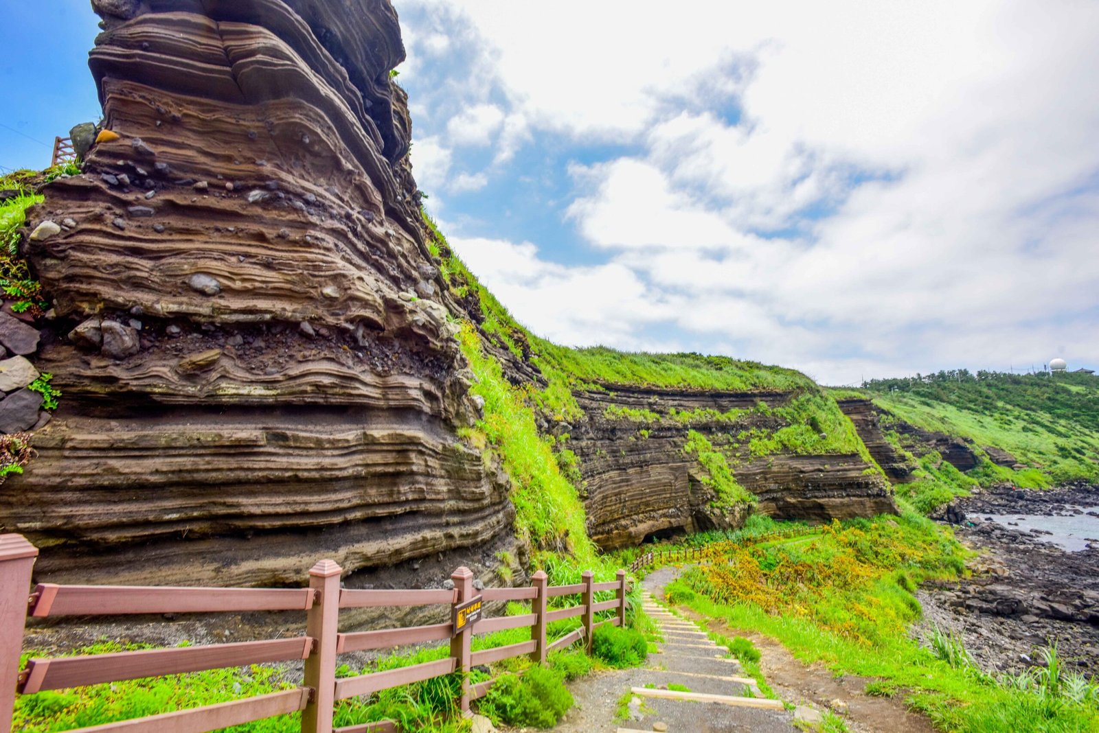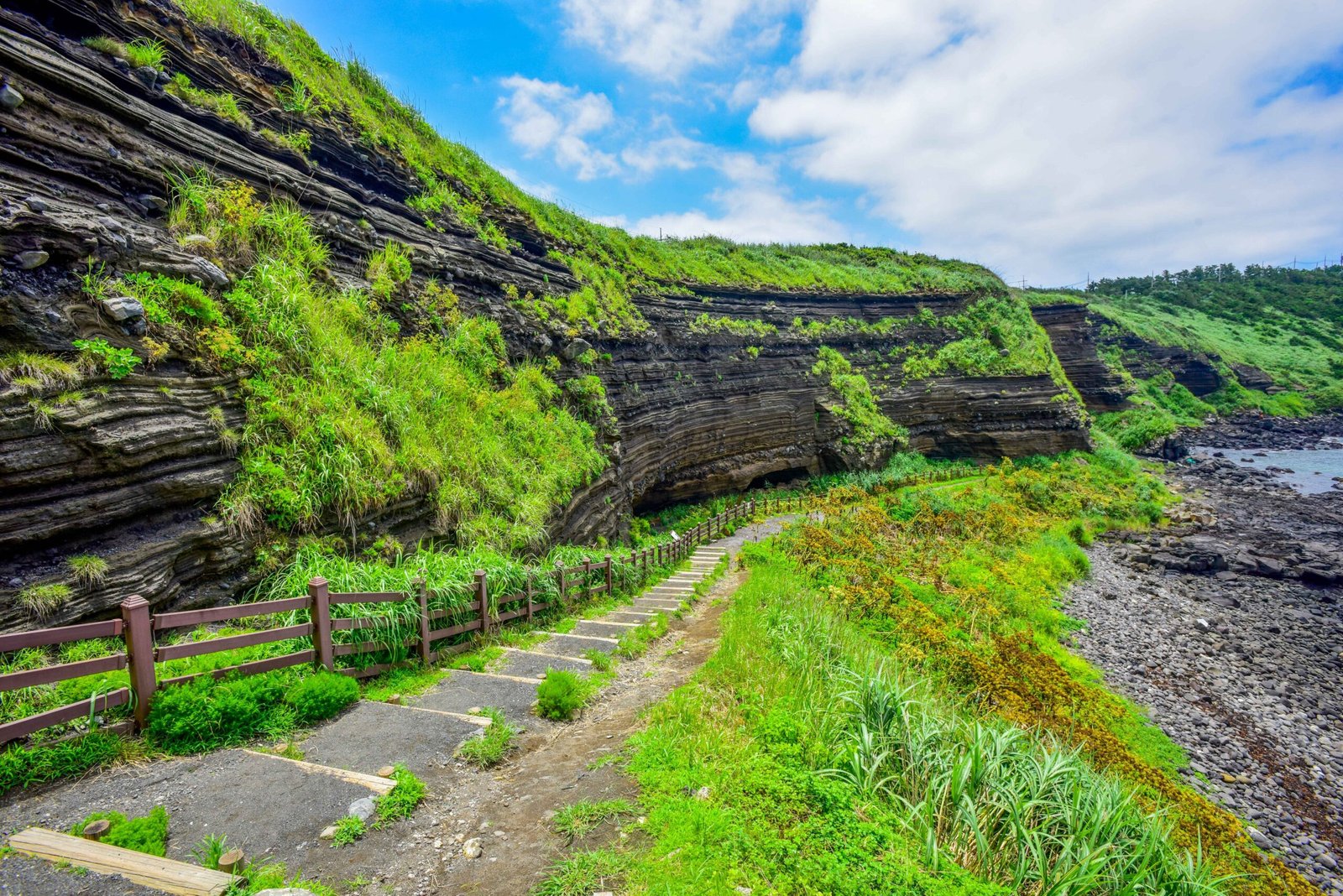 The trail is approximately 1km long and takes about 30 minutes to an hour to complete. The gentle slope makes it an easy walk for everyone. Along the way, you can admire the breathtaking scenery, with small islands stretching across the horizon, particularly Chagwido and Sagwido, both designated nature reserves. Surrounding the trail are the remains of artificial caves used during the Pacific War and the Japanese colonial period, offering a glimpse into Jeju’s history.