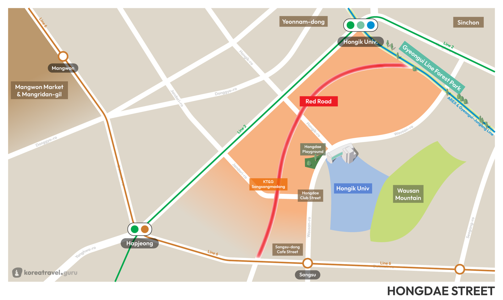 Hongdae’s main hotspot where major attractions cluster and the geographic heart of the district. It was known by various names like Eoulmadang-ro, “Hongdae Walking Street”, “Hongdae Festival Street” or “Hongdae Shopping Street” before being rebranded as “Red Road” around 2024 as a tourism initiative.