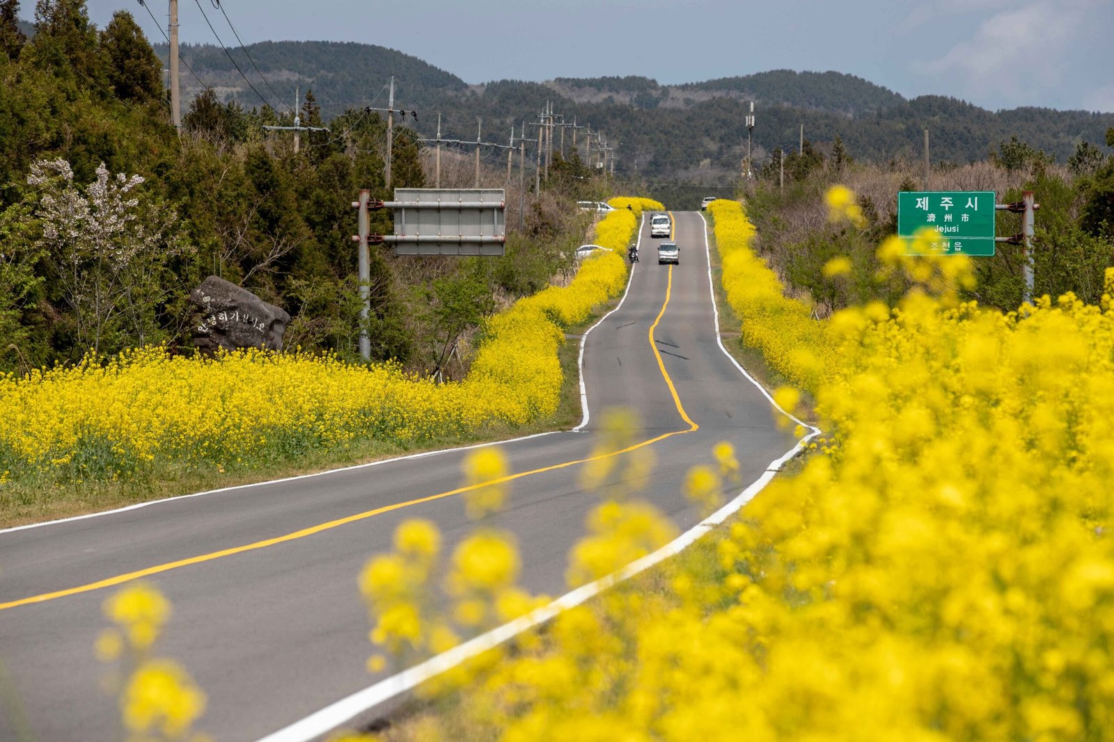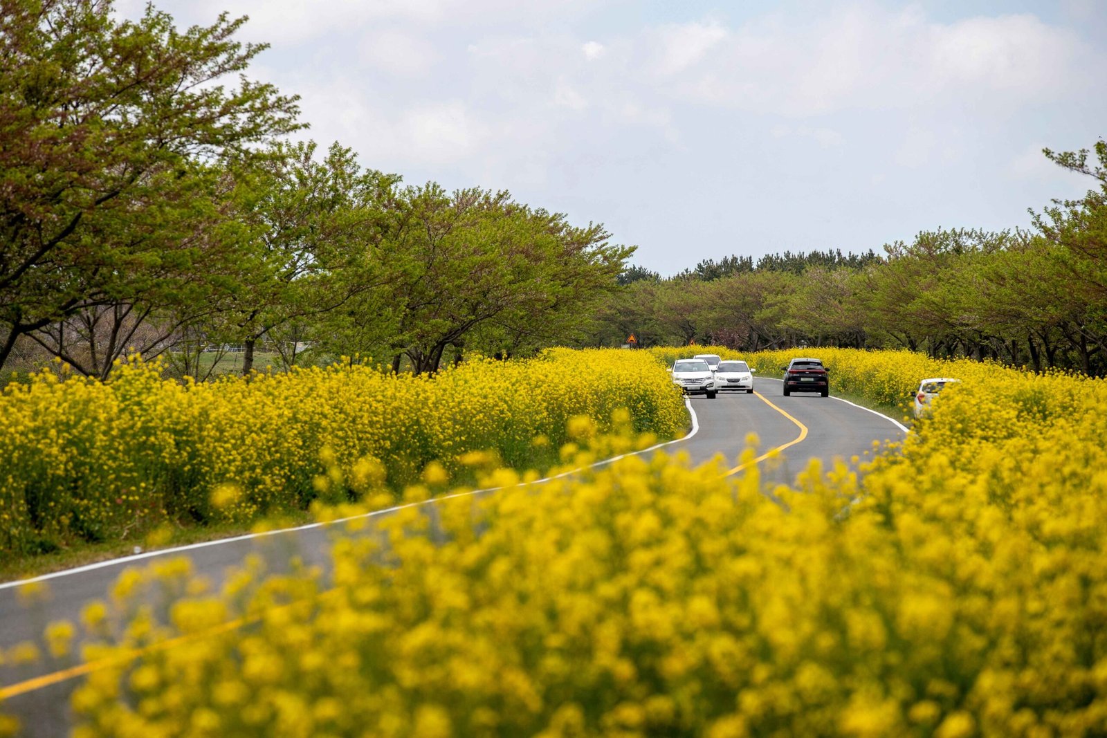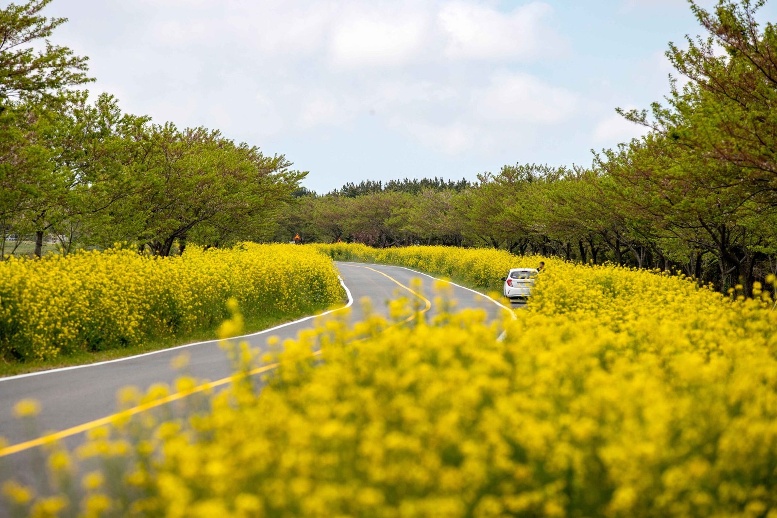 Jeju’s most beautiful spring road with 10km of yellow canola fields stretching through Gasi-ri.