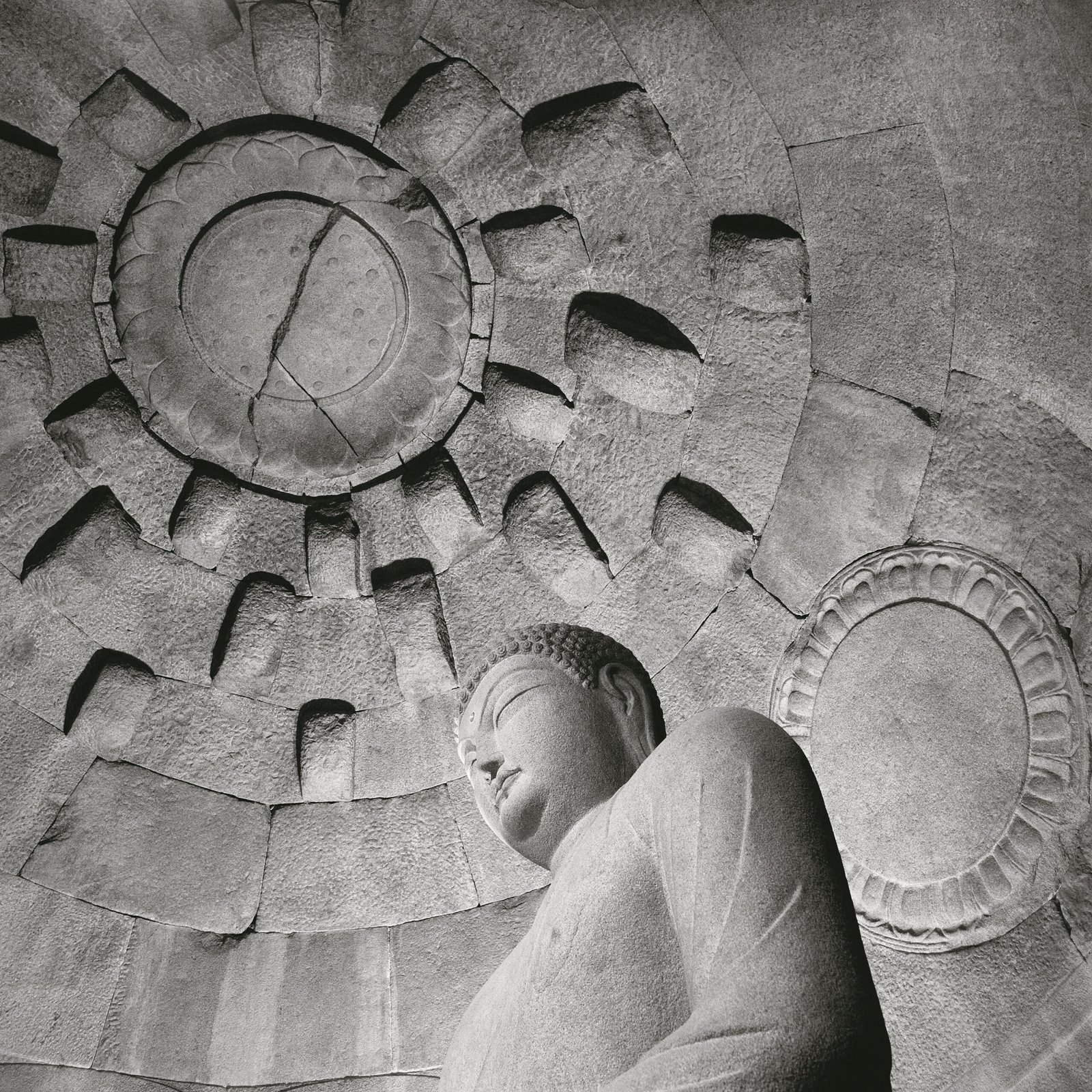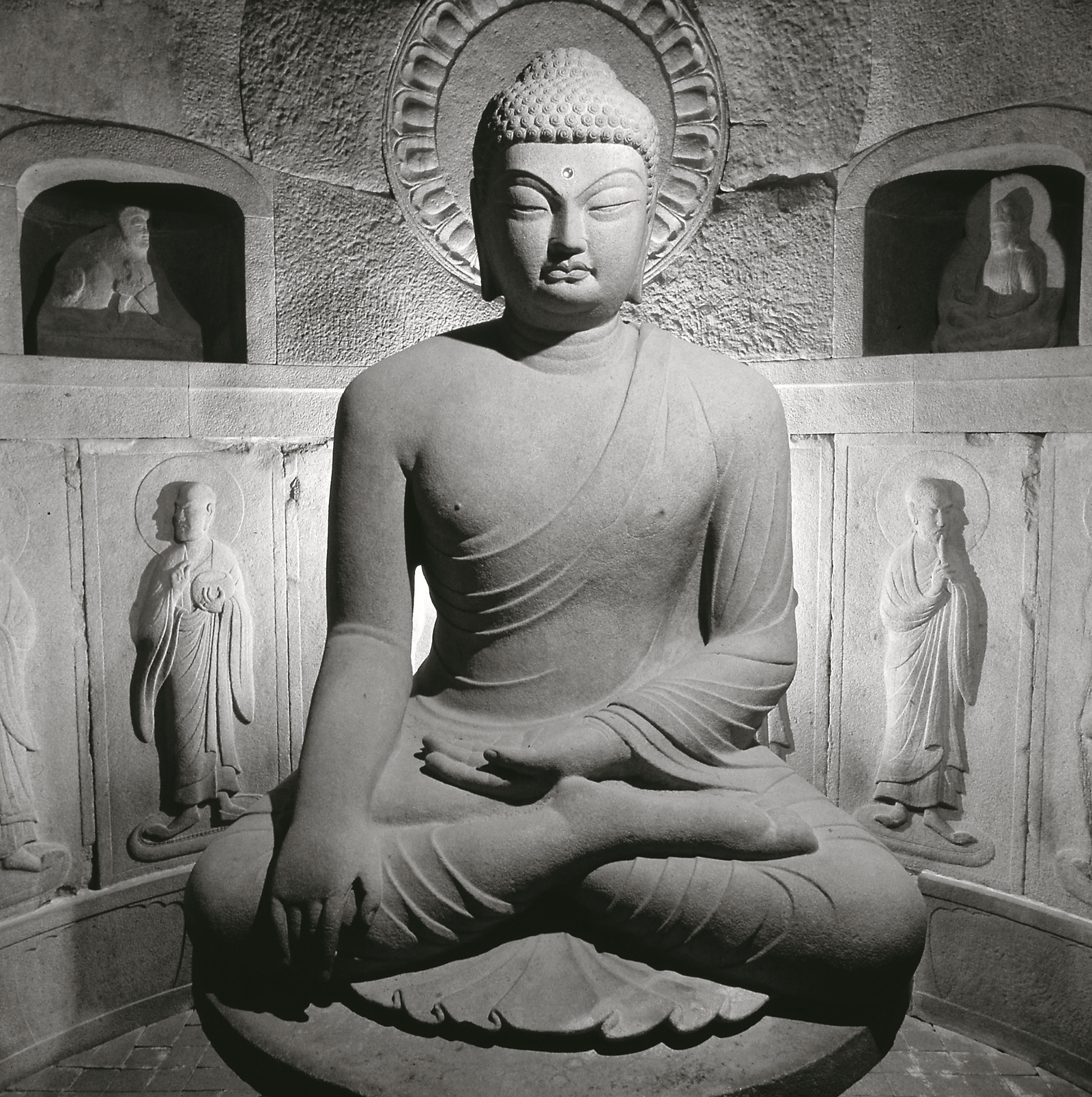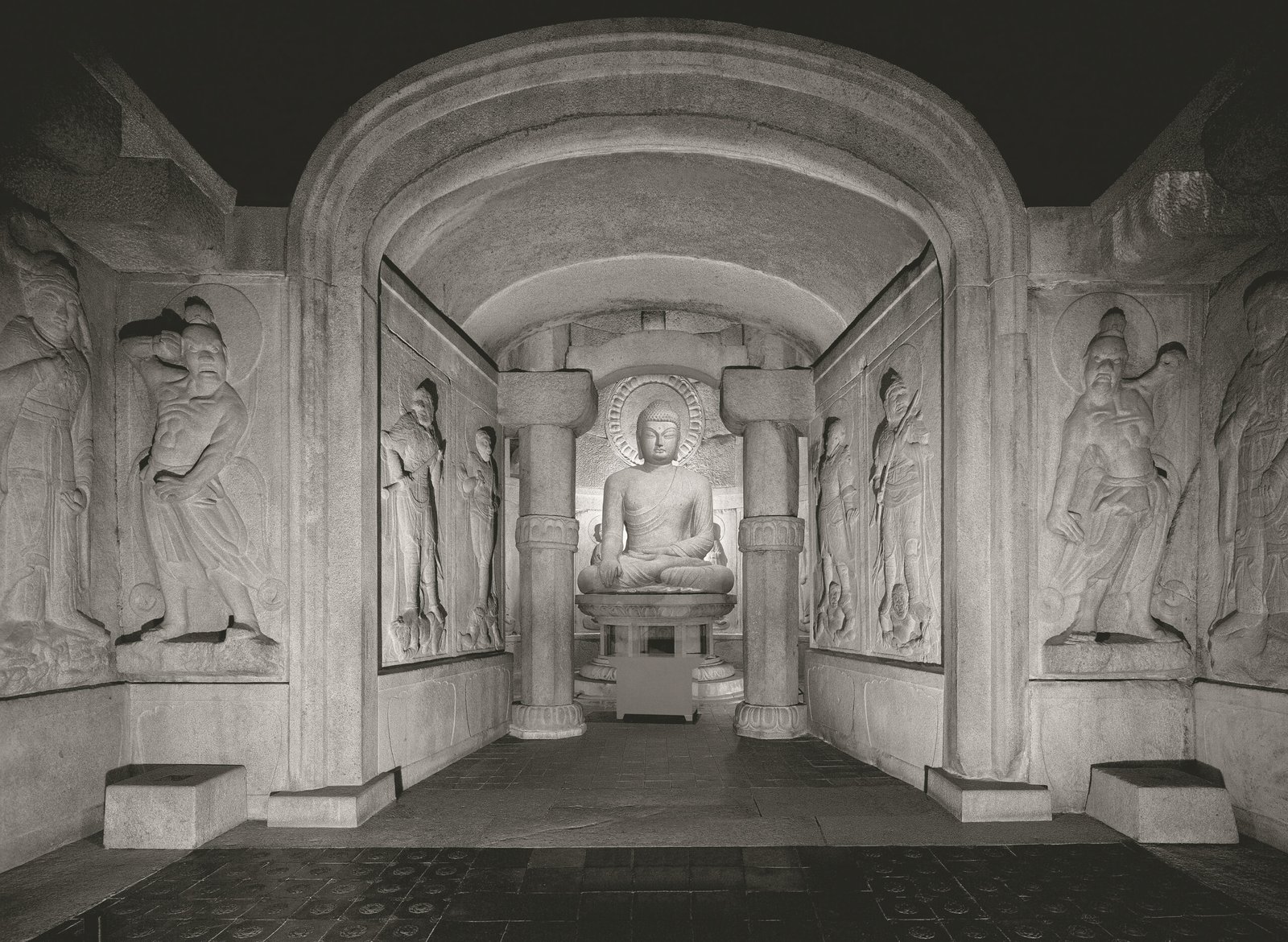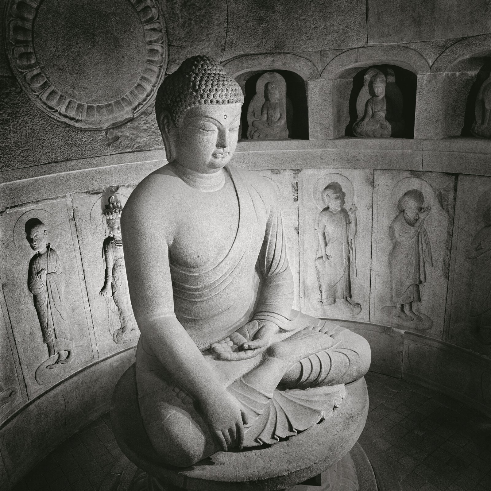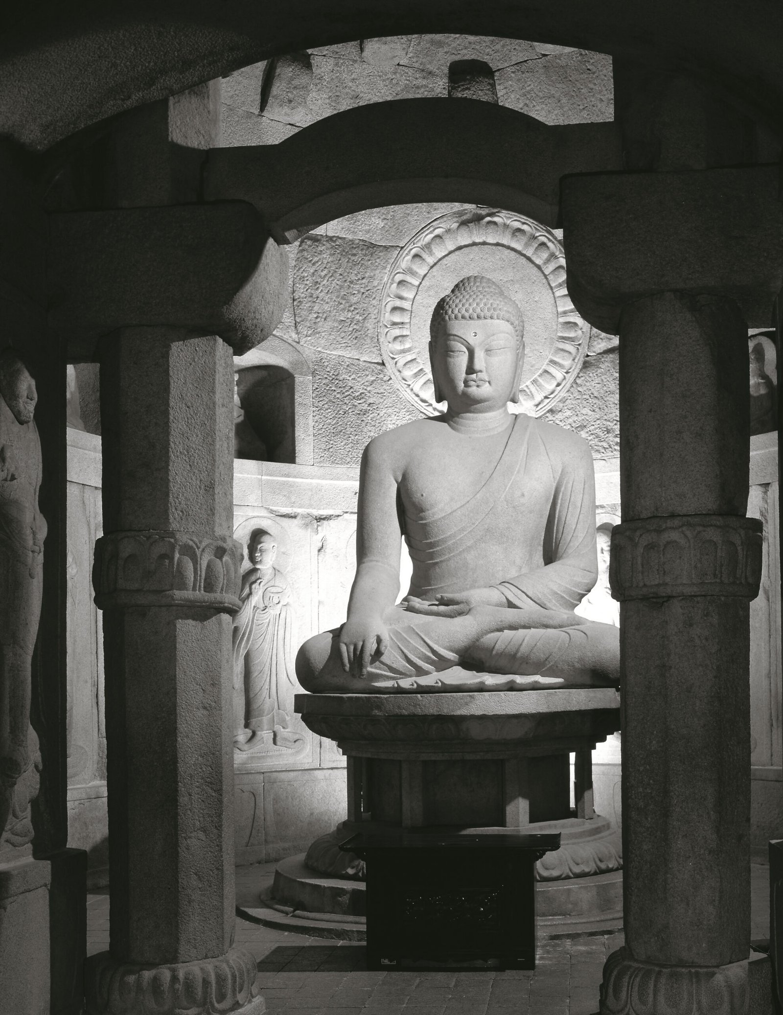 These grottoes were built by Kim Dae-seong in the 8th century (751–774 of the reign of King Gyeongdeok of Silla). The structure is artificially constructed of granite. The circular main chamber features a gigantic seated Buddha statue in the center, surrounded by realistically carved high and low reliefs of various deities, bodhisattvas, and disciples. This makes it a masterpiece of East Asian Buddhist sculpture. The Buddha sits facing the sea, adopting the mudra (Dhyana Mudra) and the earthly seal, representing meditation and enlightenment.