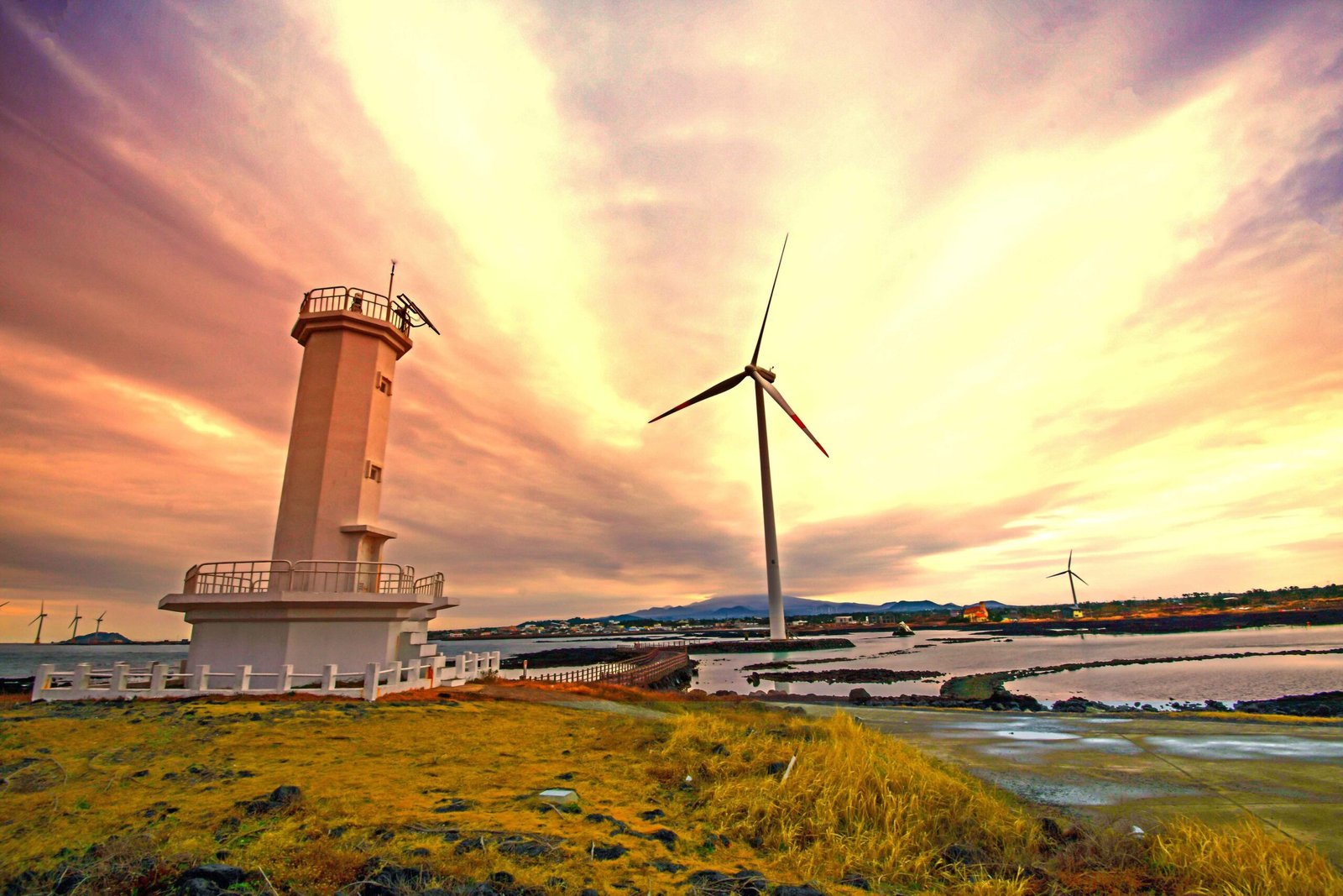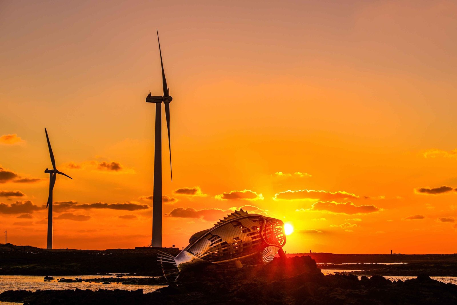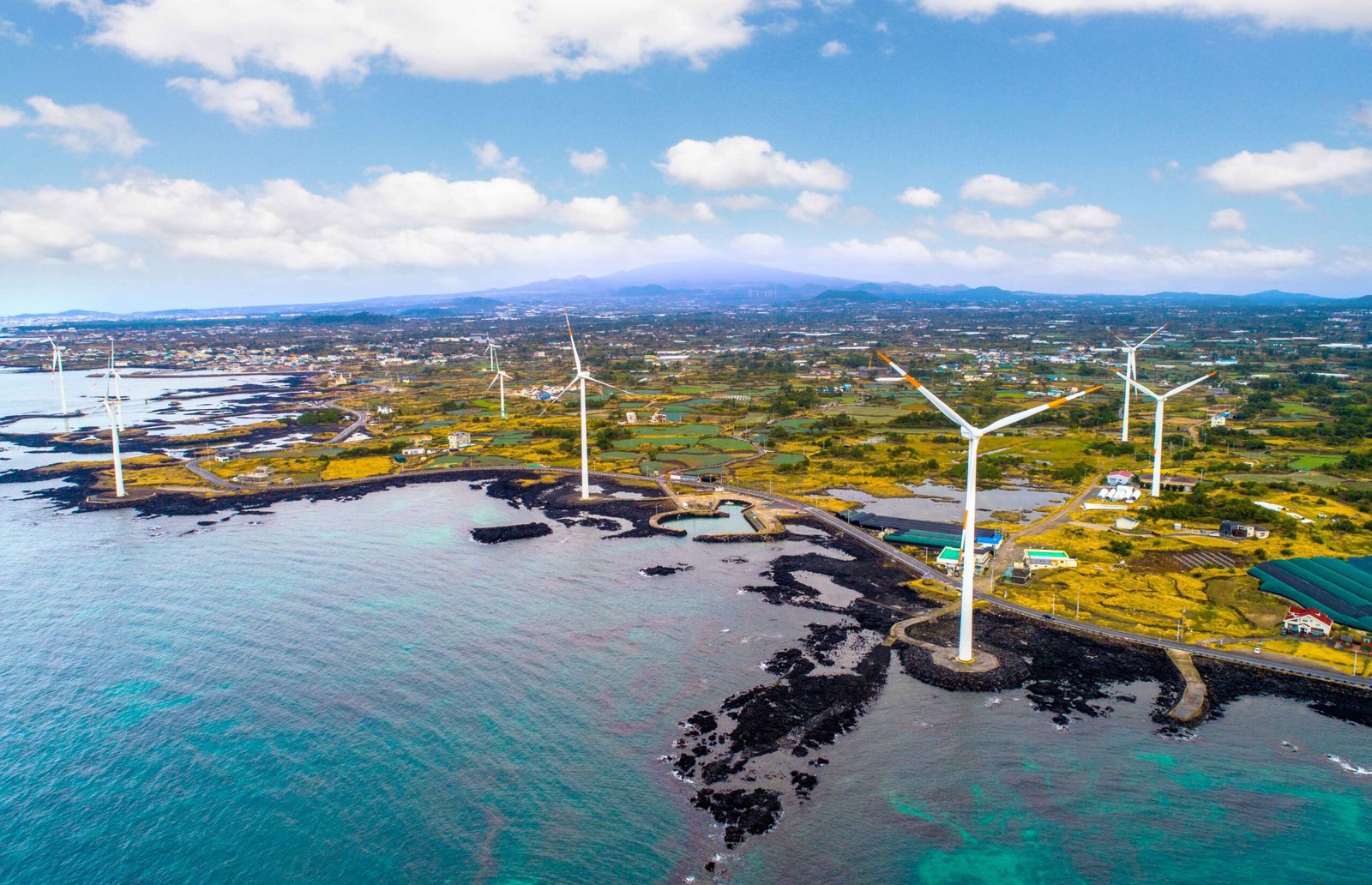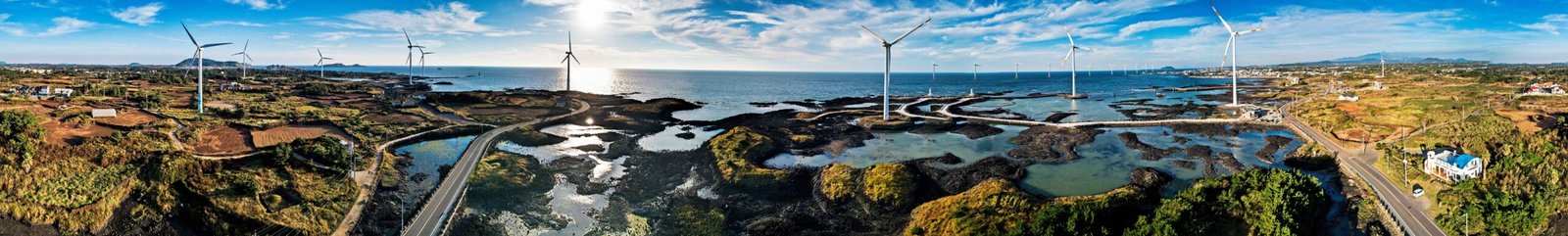 The Sinchang Windmill Coastal Road, located at the western end of Jeju Island, boasts a beautiful landscape of white windmills lined along the road, complemented by the emerald sea, thanks to the offshore wind farm.