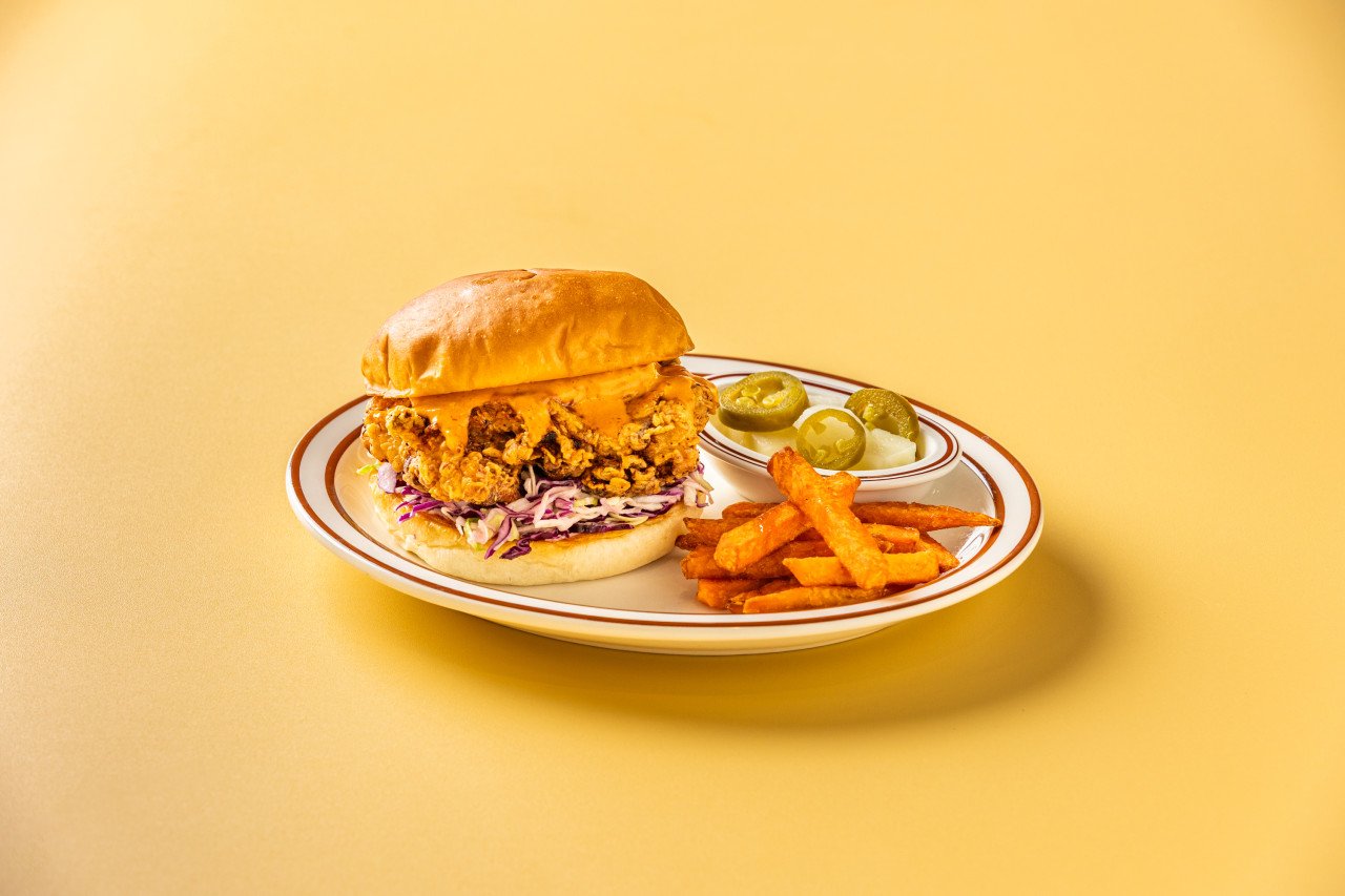 The menu features chicken burgers, tacos, and bowls, with popular sides like sweet potato fries and coleslaw.
